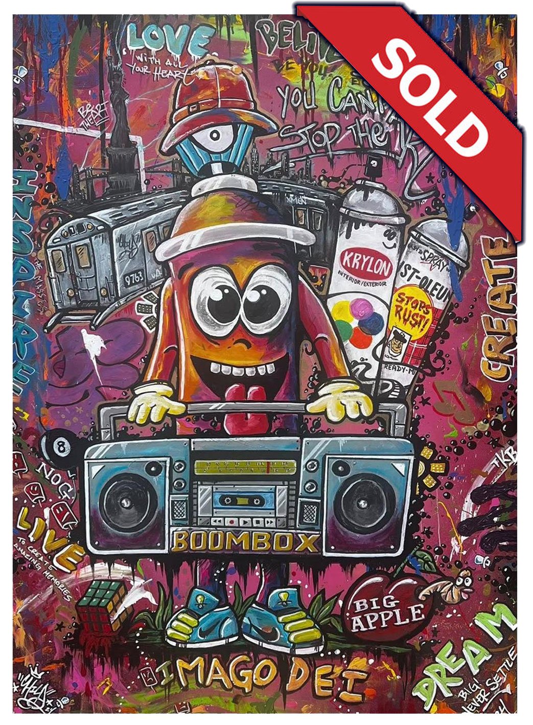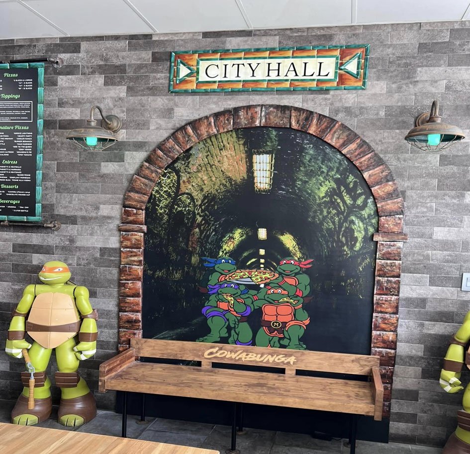 The Artist, Child and his wife Margeaux, designed the interior of this business and fabricated key elements of the decor. Those elements were the subway bench, tunnel, city sign and menu board as well as the rear logo sign.