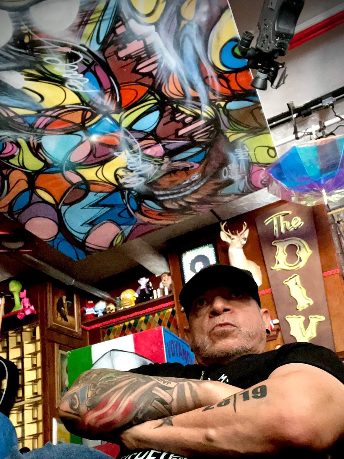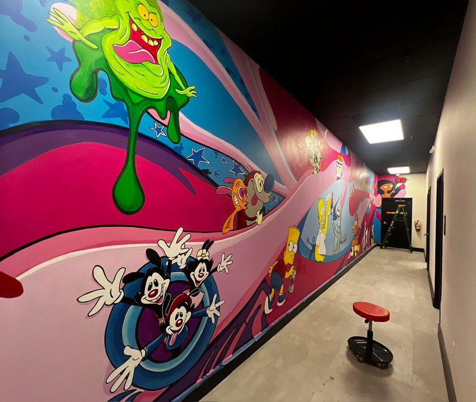Within this location you will find featured designs by the artists such as the hanging 6ft boombox, painted table decor, the stage Beetlejuice design and a 40ft mural.