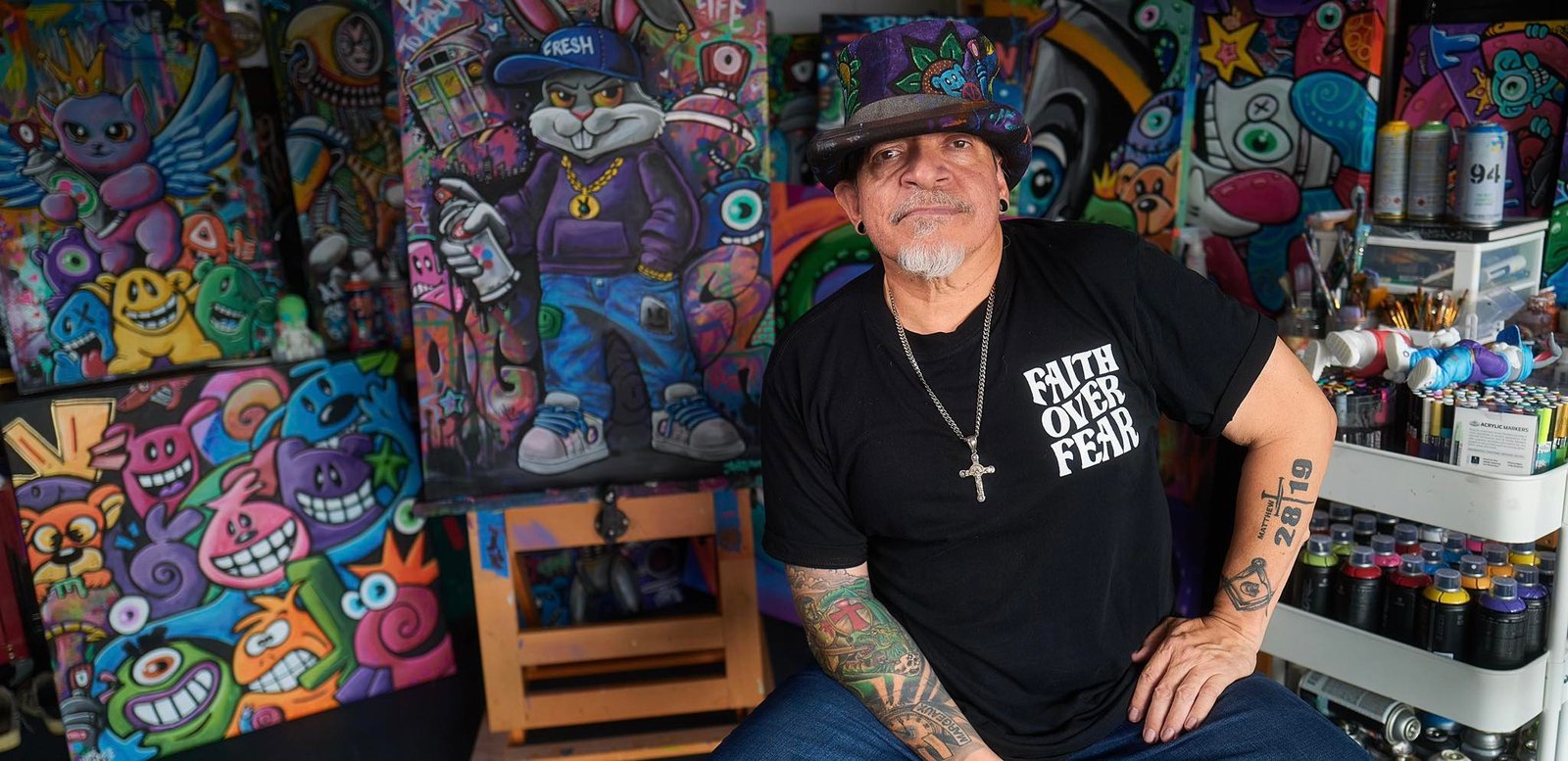 There are also canvases for sale hanging on the hallway walls.
